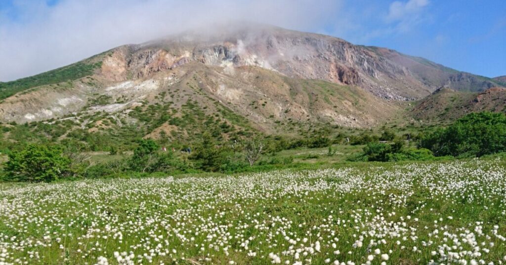 福島県にある標高1,949mの一切経山(いっさいきょうざん)はスタート地点の浄土平からワタスゲ天国です。