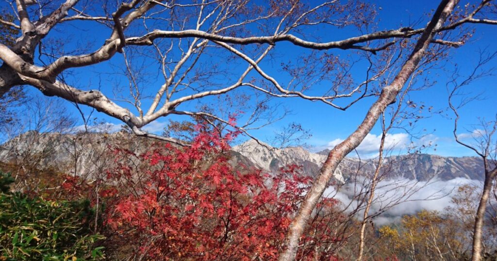 青い空、真っ赤な葉、北アルプスの白い岩肌。